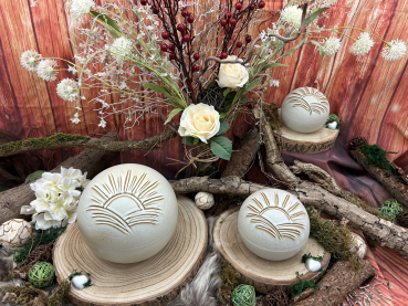 Sie haben die Wahl zwischen Urnen für den Innen- und Außenbereich sowie die Erdbestattung. Beim Material entscheiden Sie sich zwischen Keramik, Metall, Holz oder Naturstoff, sowie verschiedene Formen wie Herz, Pyramide, Kugel oder die klassische Urnenform. Als Standarturne bieten wir Ihnen ein Holzkistchen in Form einer Schatztruhe.